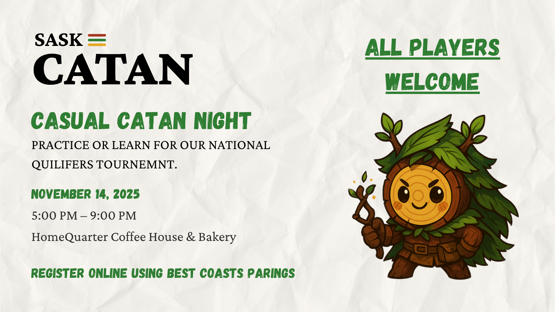 HomeQuarter Coffeehouse & Bakery 405 Avenue B S #110, SaskatoonJoin a casual CATAN game night in Saskatoon on Nov 14 at HomeQuarter Coffee House & Bakery. Drop-in 5:00–8:30 PM. New and experienced players welcome!